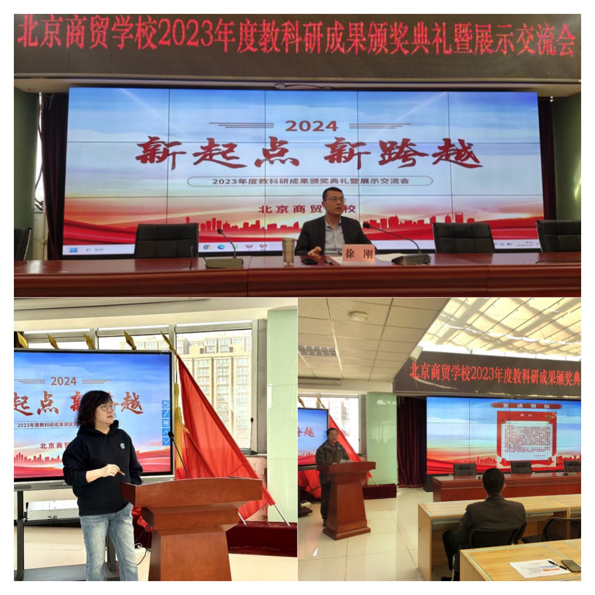 张茹同志总结了学校2023年度教科研获奖和各项成果的总体情况,督导教研室主任赵振山同志宣读贺信,徐刚同志为获奖教师颁发奖杯。2023年度,学校教科研获奖项目共62项,其中教师比赛类20项,教师指导学生技能比赛类42项,获奖教师127人次。食品商务专业部、财经事务专业部、传媒服务专业部、基础教学部分别荣获教科研卓越贡献奖、突破精进奖、攻坚克难奖和稳中求进奖。教科研成果涵盖市级在线精品课、市级专业教学资源库、教材出版、职教学会课题结题、软件著作权、“十四五”国规教材及行业规划教材立项等方面。