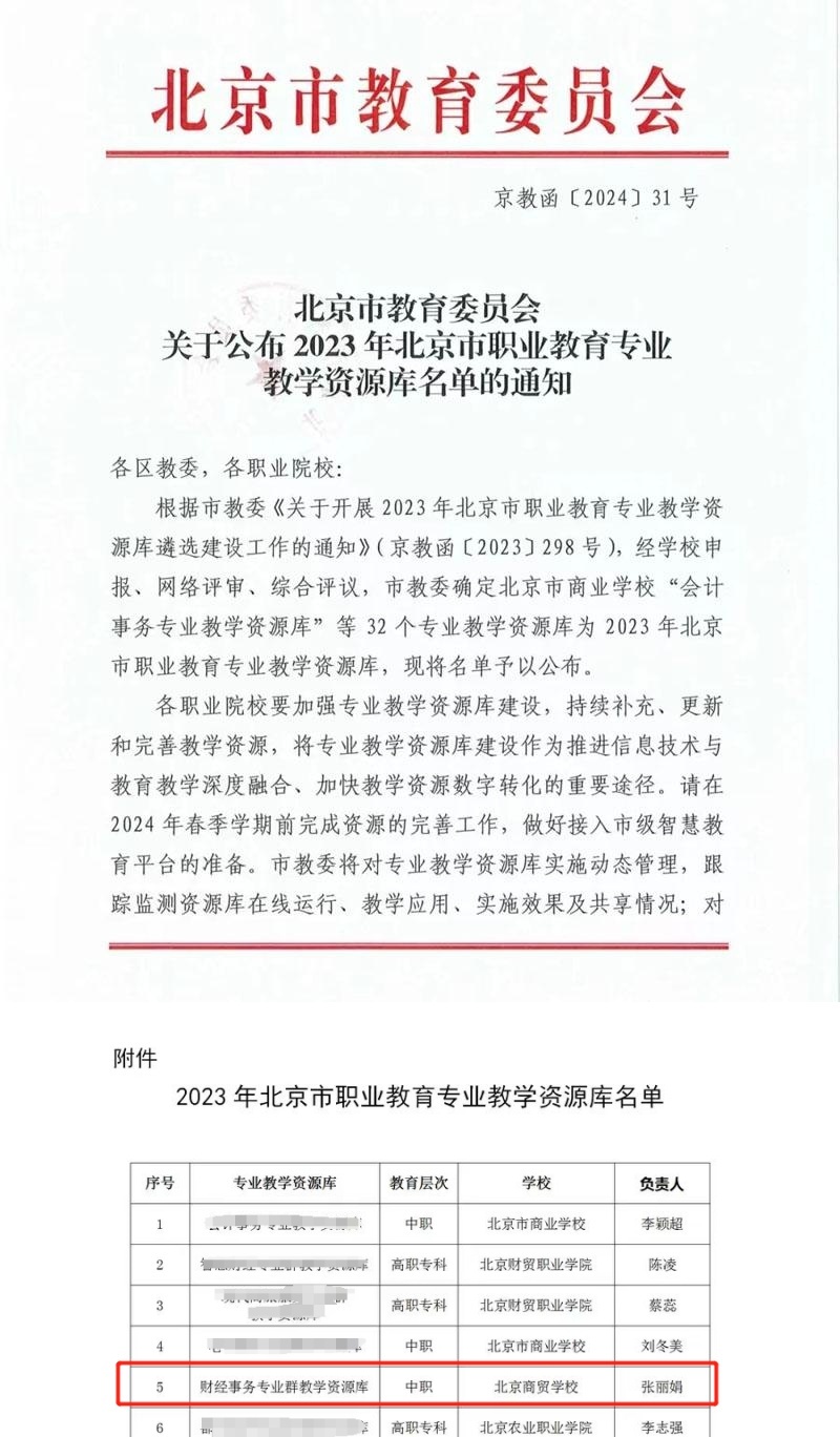 喜报!北京商贸学校财经事务专业群教学资源库入选2023年北京市职业教育专业教学资源库