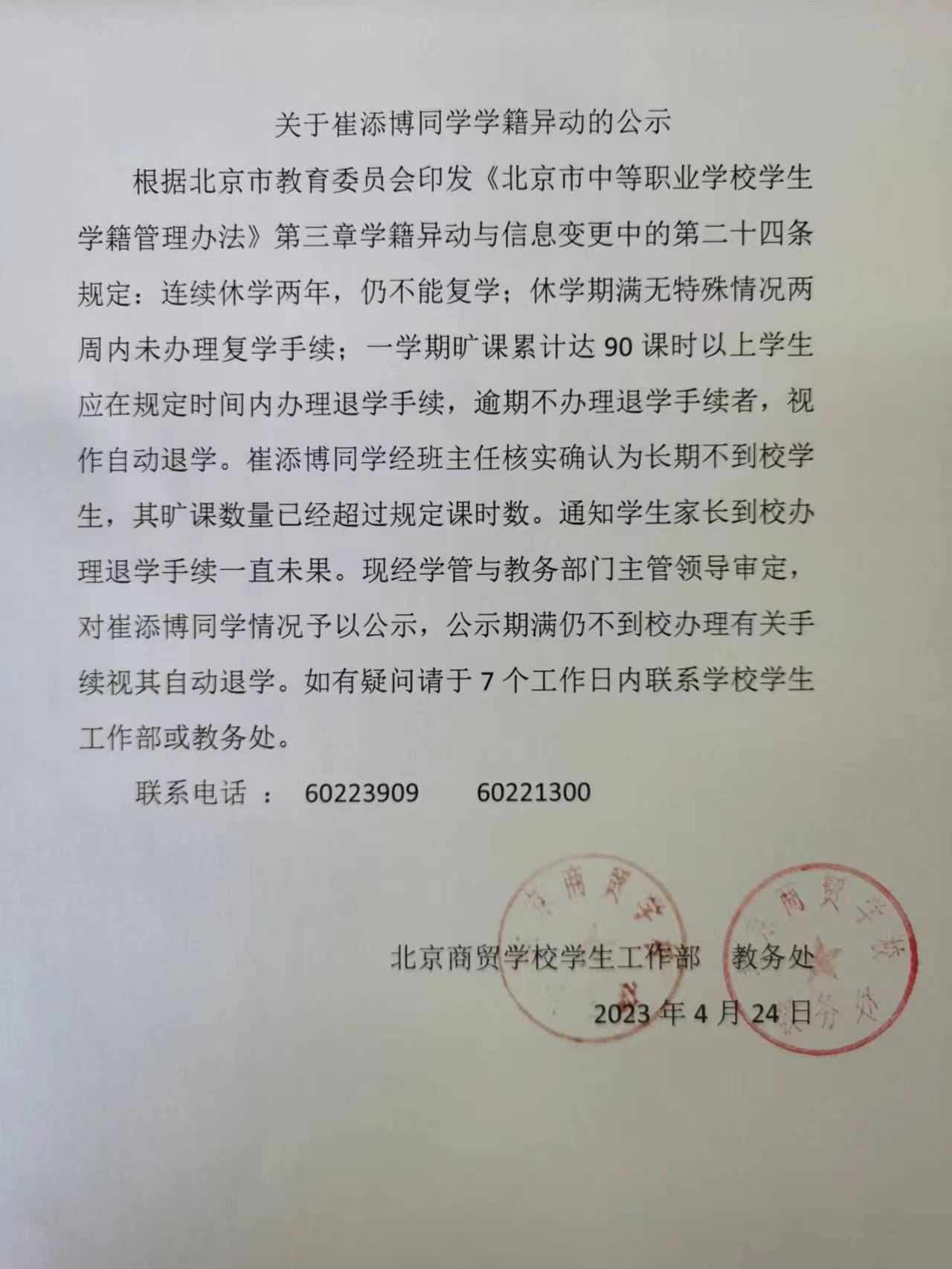 关于崔添博同学学籍异动的公示