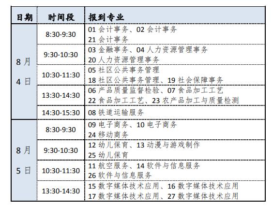 大家好!根据军训基地时间安排,结合当下疫情情况,经学校综合研究,兹定于2022级新生报到时间为2022年8月4日、5日两天,按专业分时段分批报到(具体报到时间参照下表),军训时间定为8月8日17日。