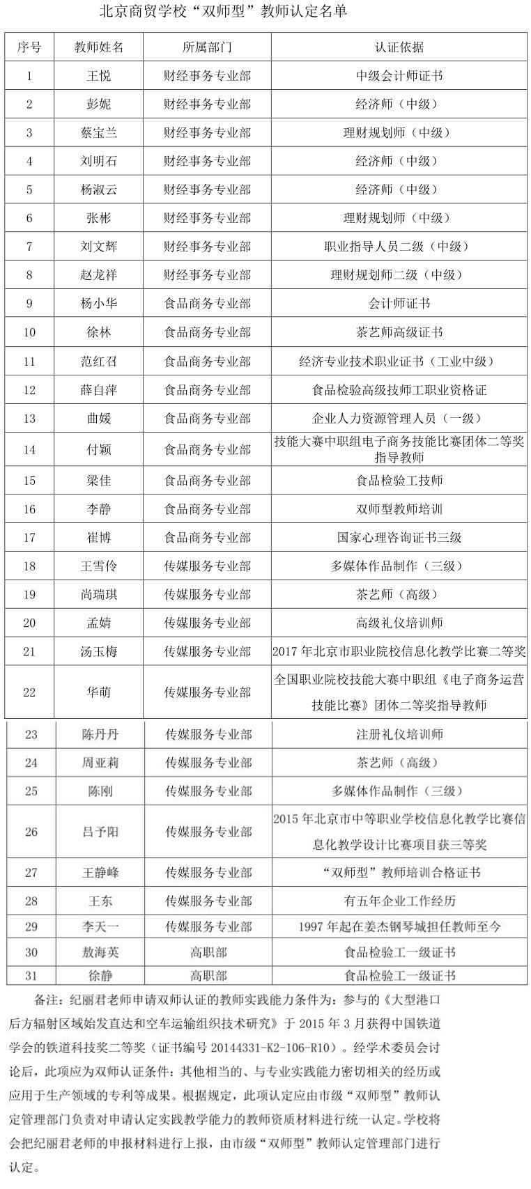 根据北京市教委《关于开展职业院校“双师型”教师认定工作的通知》有关要求,学校组织开展了“双师型”教师认定工作。经个人申报、“双师型”教师认定工作组审核、认定工作领导小组审定,拟认定王悦等31人为学校“双师型”教师,现将人员名单予以公示。公示期间,如对认定人员有异议,请以书面形式向学校“双师型”教师认定工作领导小组反映。为便于核实、反馈有关情况,书面材料应署真实姓名和联系电话,通过电子邮件送达学校“双师型”教师认定工作领导小组。我们将严格遵守工作纪律,履行保密义务。