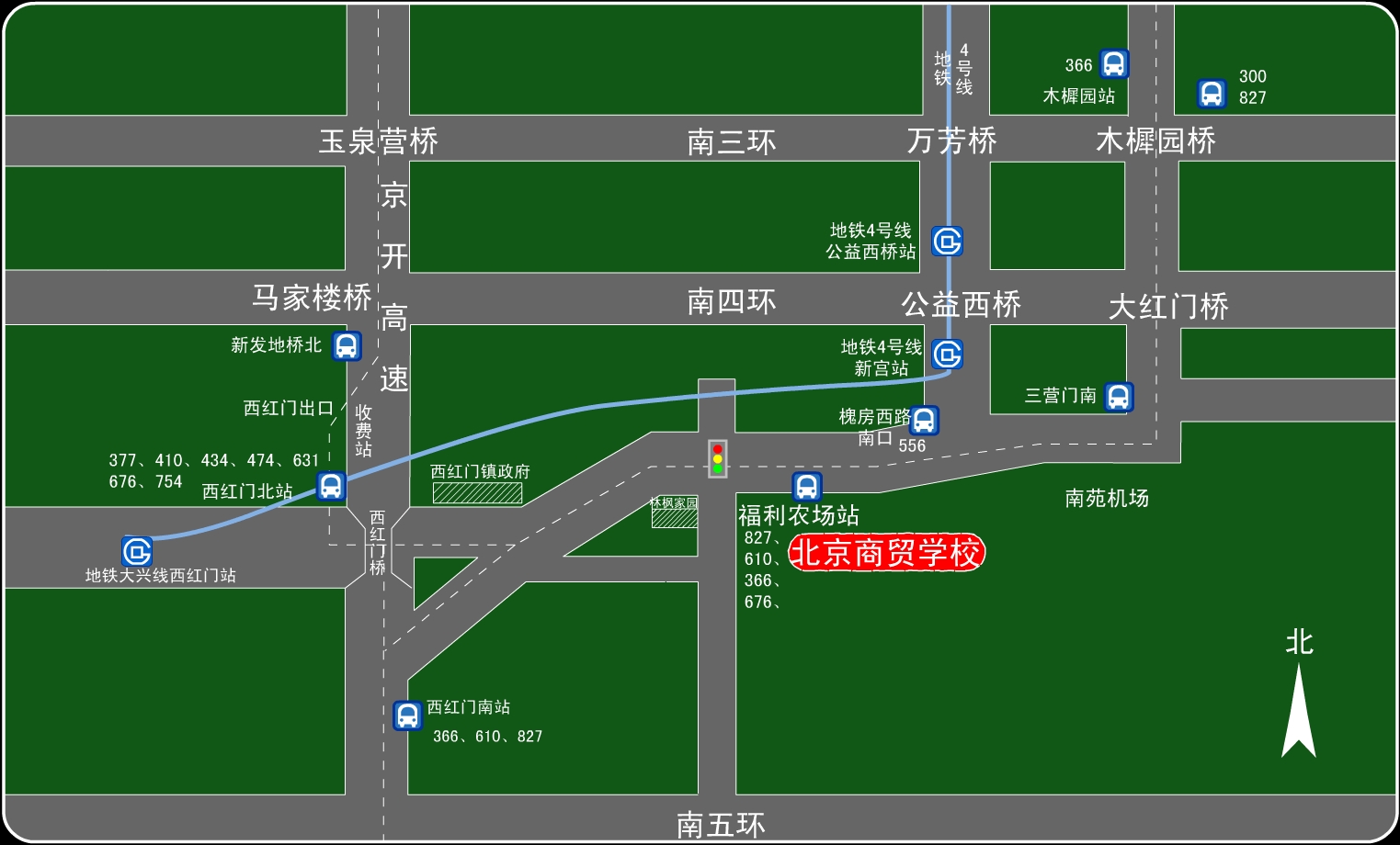 公交路线:乘366、827、829、610、676、474路福利农场站下车即是;乘410、631、679路西红门南站下车换乘366、610、827路福利农场站下车即是。乘地铁4号线新宫站下,出A口换乘827、829、474路福利农场下车即是。