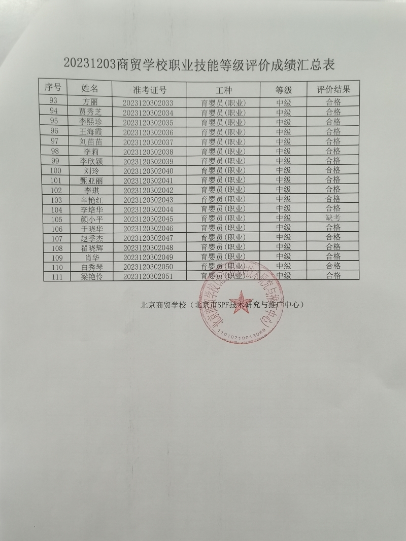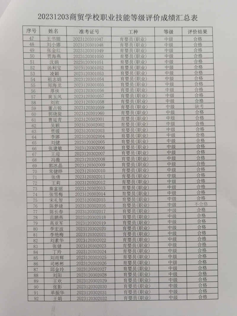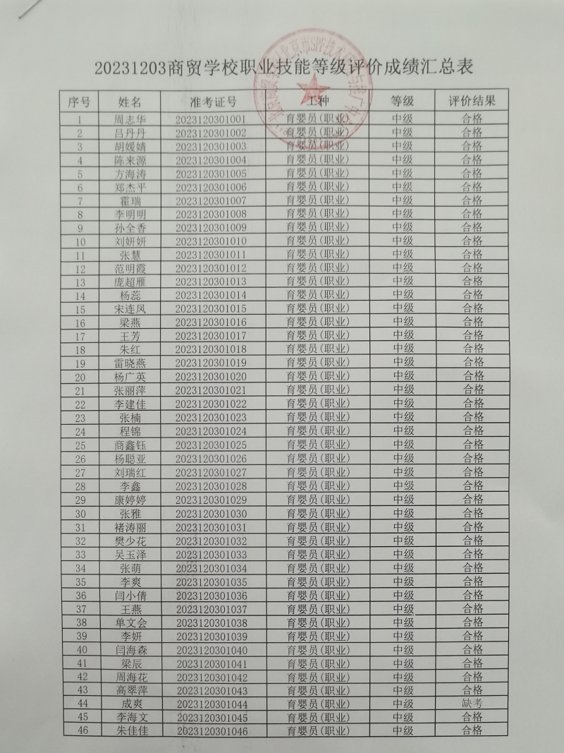 20231223商贸学校职业技能等级评价成绩公示