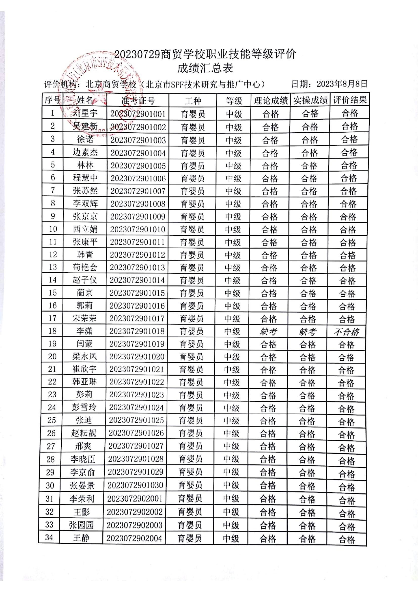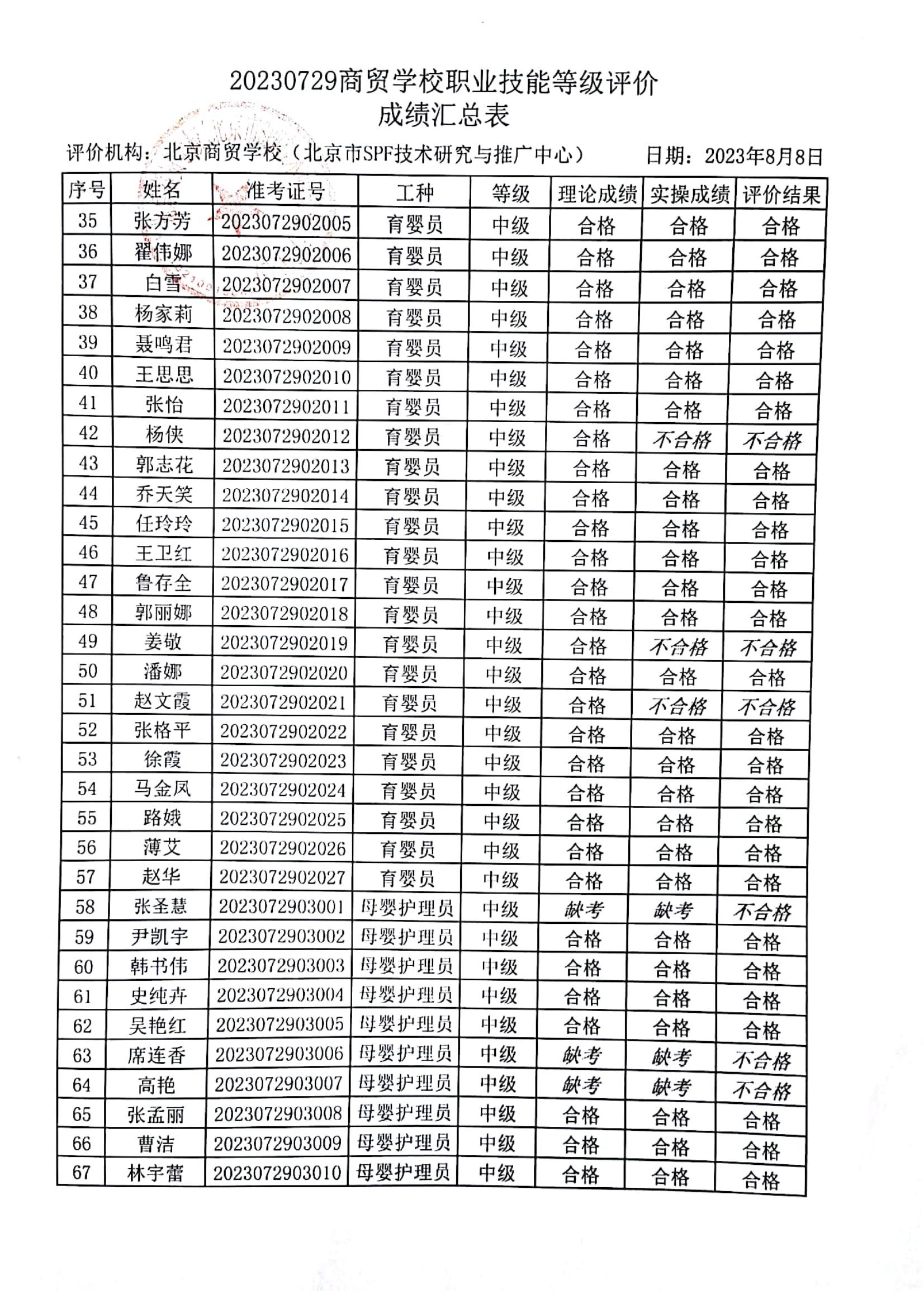 20230527育婴员初中级成绩公示
