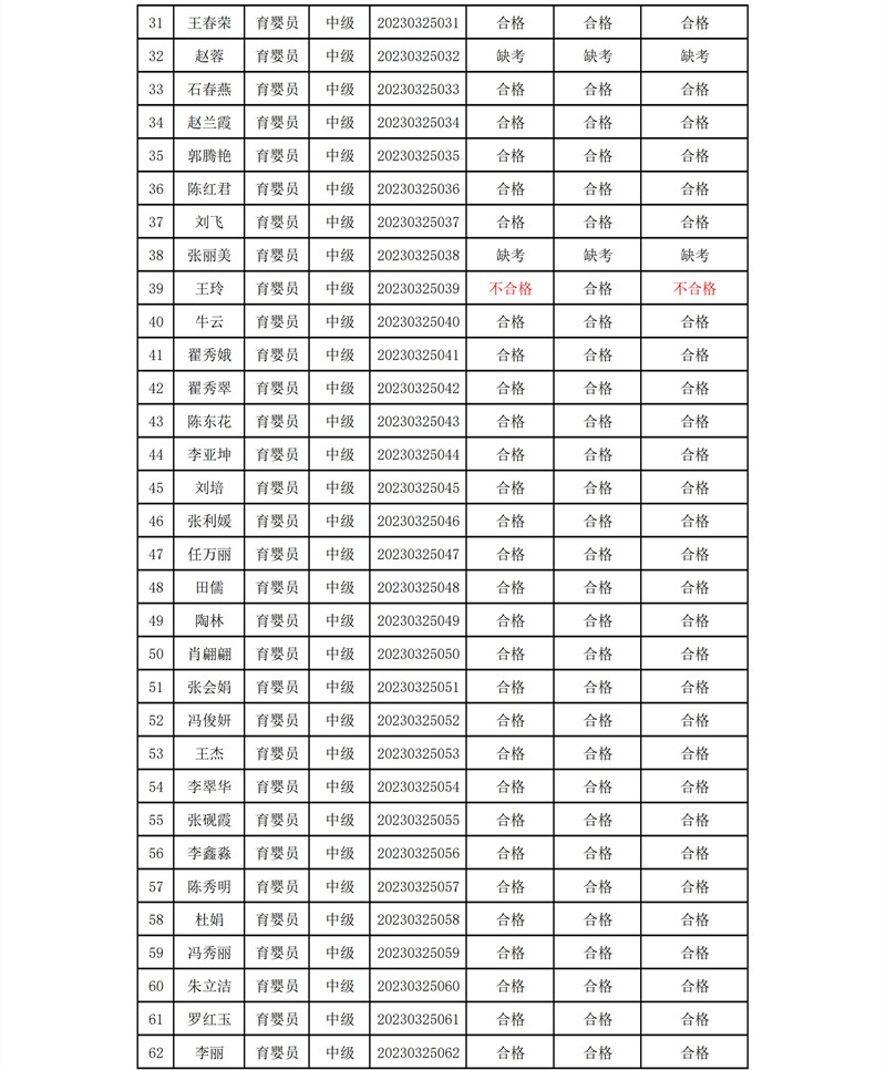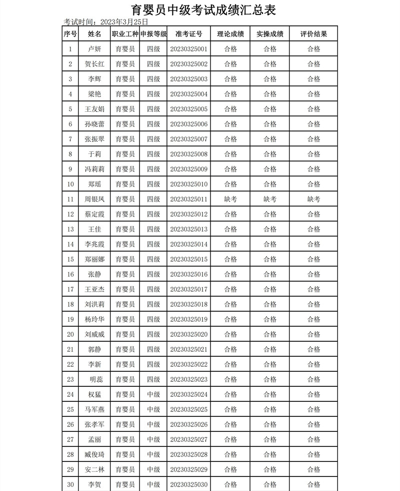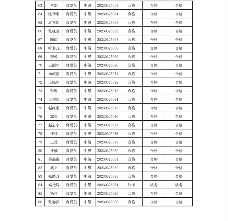 育婴员中级考试成绩汇总公示