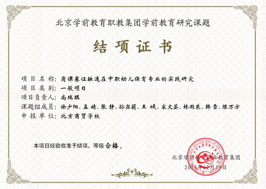 北京市职业技术教育学会 “十四五”规划2023-2027年教育科学 研究课题结题证书