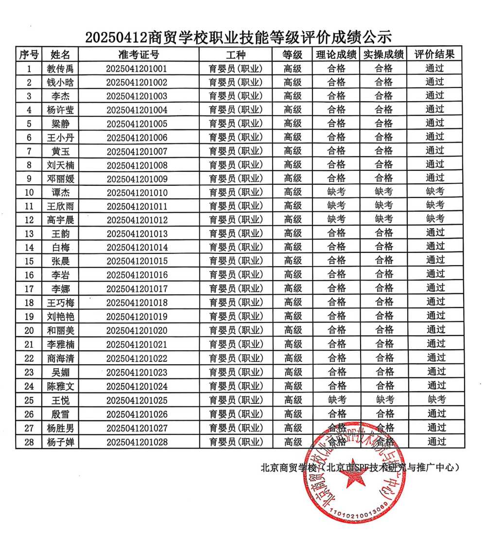 20250412商贸学校职业技能等级评价成绩公示