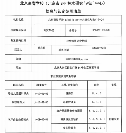 近日,北京市人力资源和社会保障局发布《关于同意北京商贸学校(北京市SPE技术研究与推广中心)调整职业技能等级认定备案信息的函》,北京商贸学校成功获批农产品食品检验员职业下三个工种(农产品质量安全检测员、粮油质量检验员、食品检验员)从初级工到高级技师五个级别的社会评价资质单位,可以面向社会开展三个工种的培训和评价工作。