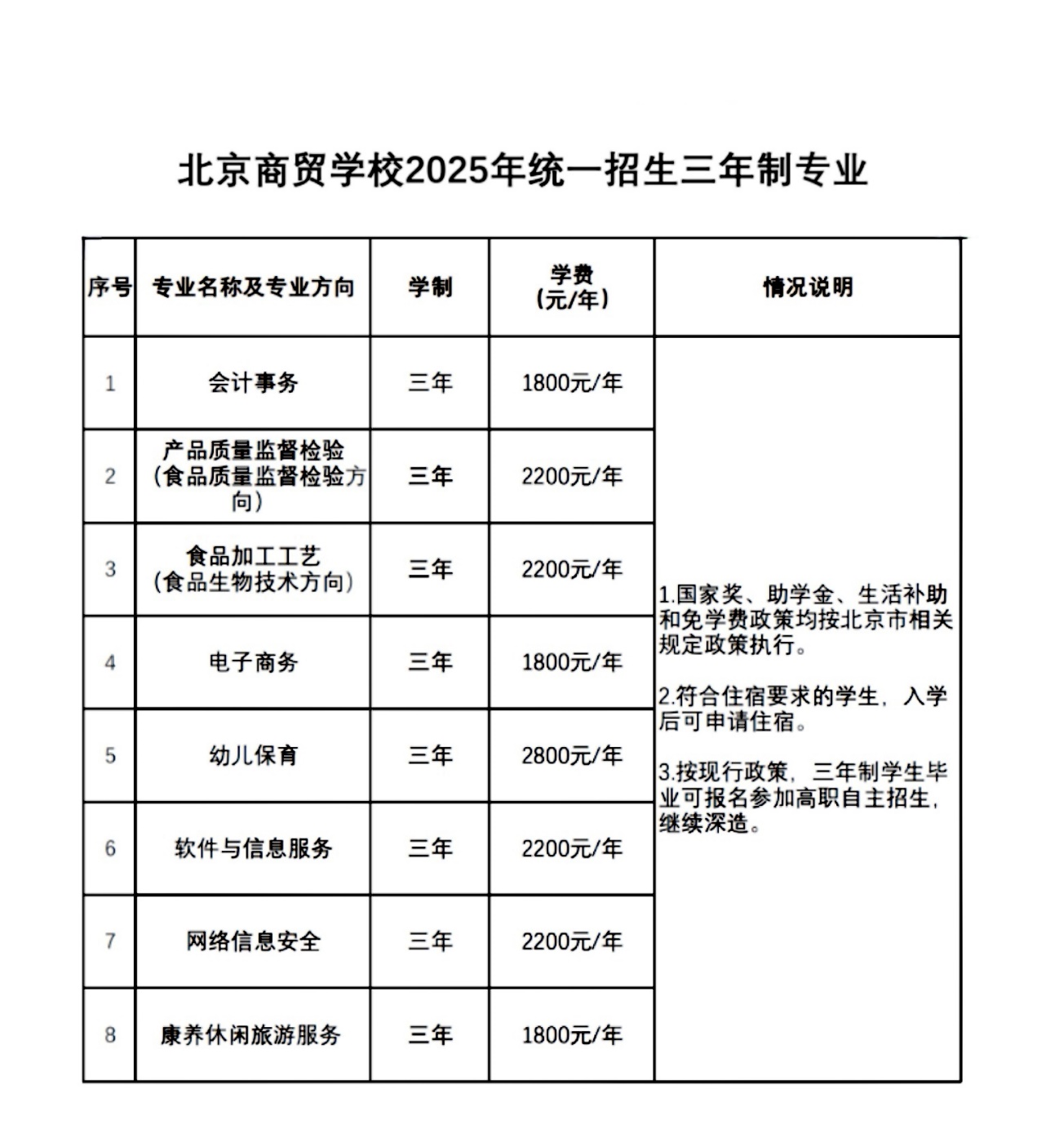 统一招生三年制专业: