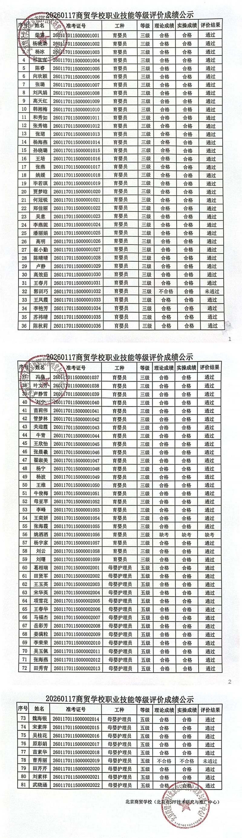 20260131北京商贸学校职业技能等级评价成绩公示